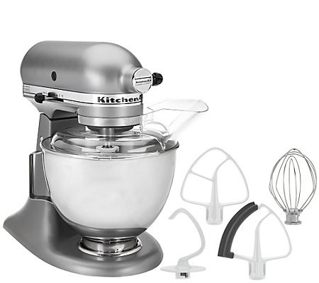 KitchenAid 4.5qt. 300W Tilt Head Stand Mixer with Flex Edge SILVER will help your job easier dexBaking just got better with this KitchenAid tilt-head stand mixer, offered in a variety of colors to match any kitchen. To sweeten the deal, this stand mixer comes loaded with features and benefits at a price you can easily digest. Mix, knead, whisk, and whip with ease. Whether the ingredients are wet or dry, thick or thin, dense or fluffy, this KitchenAid Stand Mixer does the job. Whip up something delicious with the help of the popular Flex Edge beater--designed to scrape the bowl so you can reach every last bit of your mixture. When you need to access the bowl or switch accessories, the tilt-head design makes it easy to use. Cleanup is a breeze as well, thanks to a pouring shield that helps to guard against spills--and a dough hook, bowl lid, stainless steel bowl, and coated beaters that are dishwasher-safe. Plus, the Power Hub brings even more versatility to the mixer with its compatibility with other KitchenAid attachments. All in all, this is one offer you don't want to miss! From KitchenAid. Includes tilt-head stand mixer, 4.5-qt stainless steel bowl with handle, stainless steel wire whip, coated dough hook, coated flat beater, Flex Edge beater, pouring shield, and bowl lid 300W motor 10-speed control Electronic speed sense 59-point planetary mixing action allows for quicker mixing Coated beaters, dough hook, bowl lid, and stainless steel bowl are dishwasher-safe Measurements: Mixer 14"H x 13"L x 8-1/4"W; Cord