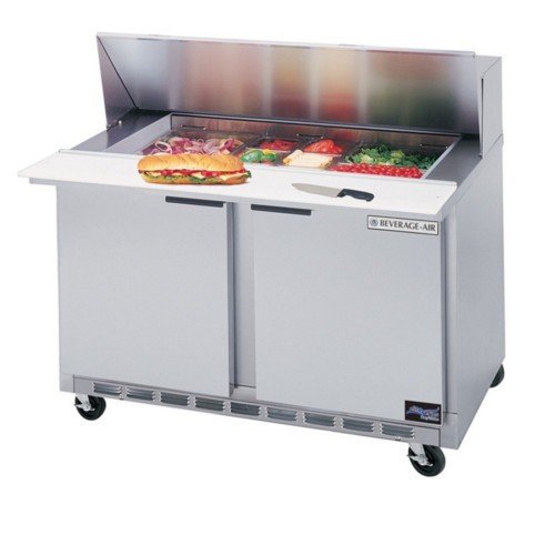 Beverage Air SPE36-08C Elite Series will help your job easier dexElite Series Sandwich Top Refrigerated Counter, two-sections, 36" W, 10.2 cu. ft., (2) doors, stainless steel top with opening for (8) 1/6 size pans, 17" cutting board, stainless steel exterior, aluminum interior, rear-mounted self-contained refrigeration, (pans furnished are 4" deep, tops will accommodate 6" deep pans) 1/4 HP, 115v/60/1, 5.0 amps, 8' cord, NEMA 5-15P, UL, cUL, UL-EPH, NSF, MADE IN USA