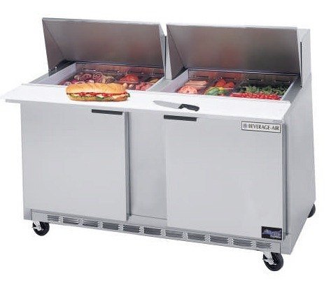 Elite Series, Sandwich Top Ref will help your job easier dexElite Series Mega Top Refrigerated Counter, two-section, 60" W, 17.1 cu. ft., (2) doors, stainless steel top with opening for (24) 1/6 size pans, 10" cutting board, stainless steel exterior, aluminum interior, rear-mounted self-contained refrigeration, (pans furnished are 4" deep, tops will accommodate 6" deep pans) 6" casters, 1/3 HP, UL, cUL, UL-EPH, MADE IN USA