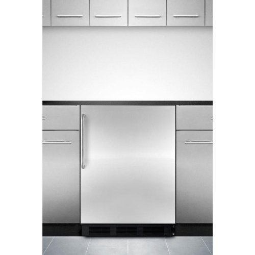 Summit Appliances FF7BBISSTB 24 Inch Wide Towel Bar Handle All-Refrigerator With Auto Defrost - Black And Stainless will help your job easier dexFully wrapped stainless steel door Professional stainless steel towel bar handle Fully automatic defrost Adjustable height Front-mounted lock Adjustable thermostat Large adjustable shelves Interior light with ON-OFF rocker switch No internal fans One piece seamless interior liner Energy efficient design 100 percent CFC Free Capacity 5.5 cubic feet Dimensions 33.125in H x 23.625in W x 23.5in D -height adjustable to 34.75in Color - Black and Stainless
