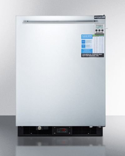 FF590SSHHMEDDT 24" wide frost-free built-in undercounter all-refrigerator with internal fan, traceable thermometer, black cabinet and stainless steel door will help your job easier dexFlexible design allows built-in or freestanding use in 24" wide spaces. Fully frost-free interior for low maintenance operation. Digital thermostat ensures more precision in temperature control. Temperature alarm warns when unit is out of range. Includes a hospital grade cord with a 'green dot' plug. Factory installed lock offers added security. Flat door liner complies with CDC guidelines. Made in North America. Dimensions: . AccuCold by Summit Appliance offers the MEDDT Series all-refrigerators with advanced features for use in medical, scientific, pharmaceutical, and laboratory institutions. Made in North America, the FF590SSHHMEDDT is a 24" wide all-refrigerator. The front-breathing design allows full built-in installation under counters, while the fully finished cabinet also allows freestanding use. The exterior features a textured black cabinet and stainless steel wrapped door with a professional handle. A front lock offers added security. The digital thermostat is located in the front kickplate for easy and precise temperature management. A NIST calibrated temperature alarm installed on the door's exterior warns when the unit is out of range and also features a current and high/low temperature readout. This unit includes a hospital grade 'green dot' cord for added safety in high traffic environments and a preinstalled probe hole for users to connect their own monitoring equipment. Inside, the FF590SSHHMEDDT offers 5.7 cu.ft. of storage. Frost-free operation ensures a low maintenance performance, with fan-forced cooling to keep the temperature stable throughout. Adjustable wire shelves offer flexible storage and the flat door liner conforms with the CDC's recommendations for refrigerator design. In addition to the feature package included with this unit, the FF590SSHHMEDDT can be customized with additional options, including a self-closing door and open door alarm.