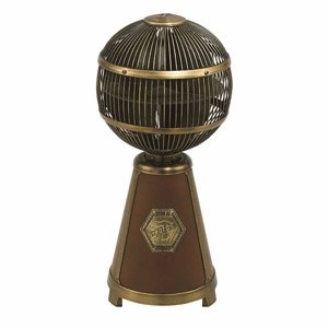 Fanimation FP3320BG Fargo Tabletop Fan, Burgundy Faux Leather/Brushed Brass Finish will help your job easier dexA globe-shaped top harkens back to yesteryear in the design of this unique Fanimation 20 in. Fargo Desktop Fan. The fan, which measures 9 inches in diameter while standing 20 inches tall, is an ideal fit for large desks or as a display feature on console tables and spacious bookshelves. Although its globe-shaped design makes the fan an obvious standout, not to be overlooked are its smart, innovative structural features, which include horizontal fan blades, a convenient 3-speed switch, and a 110-volt motor. The fan comes with a lengthy 8-foot power cord and a user-friendly carrying handle, making it easy to transport from desk to bedroom to living room console and back again, depending on that evening's specific comfort needs. About Fanimation 27 years ago, in a Pasadena garage, Tom Frampton pursued a desire to create innovative, high-quality ceiling fans by producing his very first design, the Punkah. Before long, the market began to take notice of Tom's designs, and Fanimation was born. Today, Fanimation offers its products in over 1,500 retail stores and 33 countries. Fanimation's unique designs have been used in magazines such as Vanity Fair and Modernism, as well as gracing both the large and small screens on HGTV and Extreme Makeover Home Edition, and the film ''I, Robot''. Tabletop fan with globe-shaped cage. Offered in a variety of colors. Horizontal fan blades powered by a 220v motor. 3-speed switch on rear of unit. Protective rubber feet and carrying handle. Rated for dry locations only. UL listed. 8-foot power cord. Manufacturer's limited lifetime motor warranty. Dimensions: 9 diam. x 20H in..
