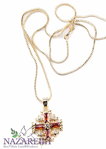 Gold Plated Jerusalem Cross Pendant Necklace Red Garnet and Zircon Gems 0.7" will help your job easier dexHigh Quality Holy Land Gold Plated Jerusalem Cross Pendant With Red Garnet Crystal & Zircon Gems 0.7' Handmade Very Detailed Pendant From Holy Land .Comes with Gold Plated Necklace , The pendant will remain same quality for many years it very high quality gold plated pendant.