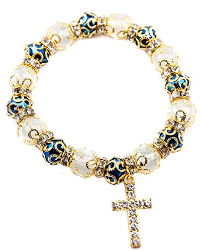 Golden Agate Beads Bracelet With Deep Blue Crystals & Cross Stretch Jerusalem will help your job easier dexHandmade Christian Men, Women Hand Ornament Golden Tone Bracelet With White Transperent Agate Beads And Beautiful Blue Crystals Combined With Hanging Cross Crucifix Bejeweled with Zircons, Unique Work From Jerusalem Holy Land . A Charming gift for family members and close friends Looks Much More Impresive in Real ,We Garantee you will like it.
