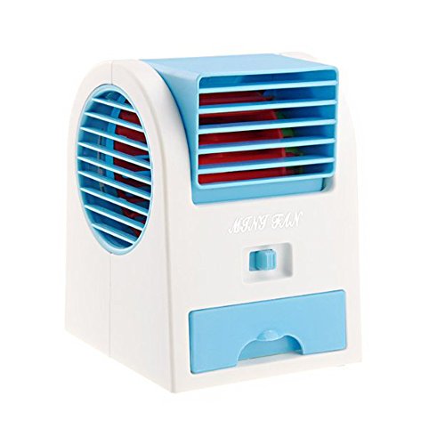Cooling Freezer Bladeless USB Mini Portable Air Conditioner Fan Aqua Blue will help your job easier dexDescription: - Hot summer must-have little gadget. It could make air more fresh. - Special plastic structure design, more stable and stronger - For easy portability; Creative mini fan, the stability speed, low power consumption. - Directional use, wind direction can be adjusted up and down. - Bottom with small drawers, placed in the aromatic beads, also can add other essential oils, perfumes,ice water ; Key Features: 1). Powered by USB cable or 3X 1.5V batteries 2). ON/OFF switch on the outer case for easy to operate 3). Add ice or ice water into the storage box, to provide you freezing air