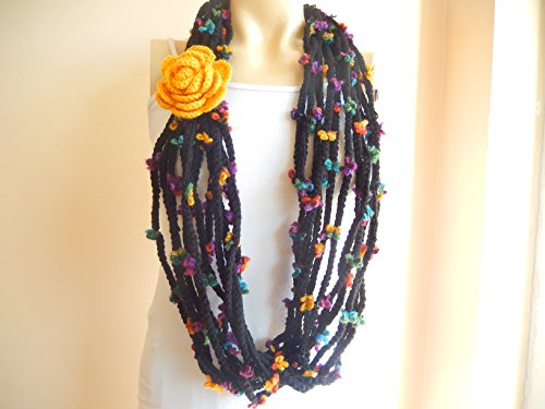 Crochet Infinity Scarf -Black Infinity Scarf -Chain Crochet Scarf with Mustard Flower Pin will help your job easier dexFeminine and stylish Infinity Scarf is one of the key trends for 2014. With this light weight scarf you can have so much fun as you can wear it in so many ways and for most occasions. You can wear it long, short, knotted or neckwarmer the options is endless. The beautiful colors and designs make this scarf more an accessory than just a functioning add-on in cold weather. Keep this light weight scarf on when you remove your coat as a comfortable fashion statement MEASUREMENTS: Colour -black and multicolor Material -Wool blend acrylic yarn and wooden button Care- Hand wash The scarves are made by me, charges like length, style etc can be easily made if required by messaging me.