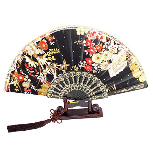 Shiny Sequins Decor Flower Print Folding Hand Fan w Holder will help your job easier dexChinese folding hand fan, great for summer outing.