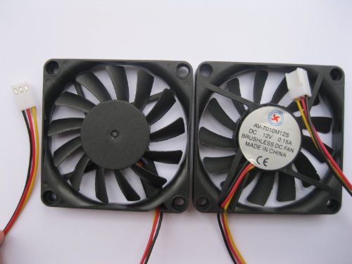 2 pcs Brushless DC Cooling Fan 12V 7010S 13 Blades 3 wire 70x70x10mm Sleeve-bearing Skywalking will help your job easier dexSpec: - Housing Material: thermoplastic UL PBT - Operating Temperature: -10 Celsius degree to +60 Celsius degree - Life Expectancy at 40 Celsius degree: 40000 hours - Blade Material: thermoplastic UL94V-0 PBT - Ultra quiet MID speed brushless DC fan, quiet sleeve-bearing design - 3 wire - 70x70x10mm, 12V - We also have other spec fans for your choice:2510, 3010, 4010, 4020, 4007, 4510, 5010, 5015, 6010, 6015, 6025, 7015, 7025,8015, 8025, 9025, 12025, 12038,14025