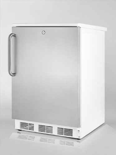 Summit FF6L7SSTB: Commercially approved undercounter refrigerator with front lock, stainless steel door and TB handle will help your job easier dexENERGY STAR certified commercial refrigerator. Stainless steel wrapped door with professional towel bar handle adds luxury to any setting. Commercially approved for use in foodservice establishments. Factory-installed lock provides security you can count on. Automatic defrost saves on user maintenance. Full 5.5 cu.ft. capacity inside a convenient 24" footprint. Includes door storage and adjustable shelves. Made in Europe. Dimensions: 33.5" H x 23.63" W x 23.5" D. AccuCold by Summit Appliance offers a wide range of all-refrigerators for general purpose storage. The commercially listed FF67 Series features high performing, perfectly sized all-refrigerators with automatic defrost and deluxe interiors designed for storage convenience. The FF6L7SSTB is a counter height all-refrigerator with a full 5.5 cu.ft. capacity inside a slim 24" footprint. Designed for freestanding use, this unit has white cabinet with a stainless steel wrapped door. A curved towel bar handle completes the look and a factory installed front lock offers convenient security. Inside, the FF6L7SSTB utilizes low maintenance automatic defrost operation. Our unique "hidden" evaporator is set behind the rear wall to create a seamless, easy-to-clean interior that also maximizes shelf space to provide generous storage. Adjustable wire shelves allow users to reconfigure the interior to accommodate a variety of sizes. Additional features include automatic interior lighting, door storage, and a crisper drawer. This unit includes an adjustable dial thermostat. The FF6L7SSTB is ETL-S listed to NSF-7 standards for use in commercial establishments and is ENERGY STAR certified as a commercial refrigerator. For a built-in version of this unit, see the FF6LBI7SSTB. For more finish options, browse the entire FF67 Series. NOTE: This unit is designed for general purpose, medical, or commercial applications and does not meet DOE energy standards for residential use.