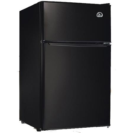 Igloo 3.2 cu. ft. 2-Door Refrigerator and Freezer will help your job easier dexKeep your groceries fresh and your beverages cold with the Igloo 3.2 cu. ft. 2-Door Refrigerator and Freezer. It's roomy enough for your perishables, snacks, drinks and frozen edibles, but small and sleek enough to fit almost anywhere. This compact free-standing reversible door refrigerator features a vegetable drawer with a glass shelf to keep your lettuce, apples and other produce crisp. Slide-out shelves provide additional room for prepared foods and packaged products. The reversible door features a built-in can holder to stack up to six cans and keep them immediately accessible as well as a built-in tall bottle holder for large soda containers, water bottles and other items. An adjustable thermostat allows you to find the right temperature for your contents. The freezer is on top and offers space for ice cream, frozen dinners and more. It also includes a door with a built-in holder. The Igloo compact refrigerator is ideal for college dorm rooms, offices, basements, rec rooms and more. The functional design and glossy black exterior lends a touch of chic style to your decor, even in places where space is a premium. Best of all, this reversible door refrigerator is CFC free and friendly for the environment. An ice cube tray is included.