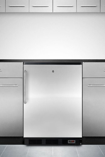 Sized with a 24" footprint, the FF7LBLBIPUBSSTB is front-breathing for built-in installation under counters but can also be used freestanding. It has a fully finished black cabinet and stainless steel wrapped door with a curved towel bar handle to complete the professional look. A factory installed lock adds security. This unit is ETL-S listed to NSF-7 standards for commercial establishments and is not intended for household use.
